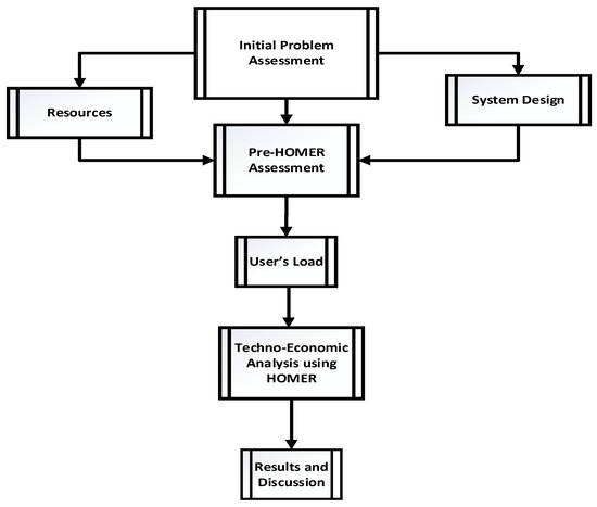 HOMER (Hybrid Optimization for Multiple Energy Resources) is a piece of software invented by the National Renewable Energy Laboratory (NREL) for the simulation, optimisation, and sensitivity analysis of renewable energy systems [34]. HOMER software is designed to provide an optimised system configuration by evaluating the available technology options based on their energy resource potential in the target location [35]. The HOMER methodology employed in this case study is presented in Figure 4 [36].