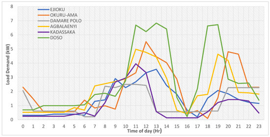 The load profile forms the basis for the configurations and solutions. The load profile of each health centre is taken over 24 h. The load demand differs for each selected location, with Doso peaking at the highest value of 6.827 kW. A comparative analysis of the load profiles of the healthcare centres distributed over 24 h is presented in Figure 5.