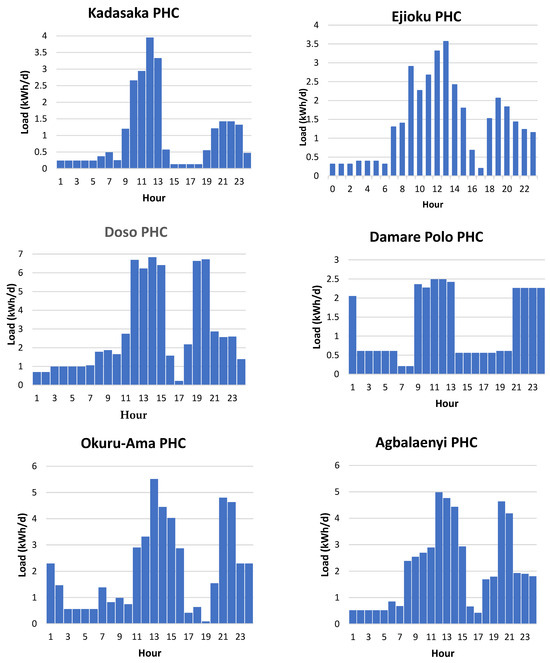 The approximate daily watt hour load demands of the healthcare centres are 67.306 kWh/d, 50.757 kWh/d, 49.739 kWh/d, 34.176 kWh/d, 23.916 kWh/d and 30.65 kWh/d for Doso, Agbalaenyi, Okuru-Ama, Ejioku, Kadasaka, and Damare Polo, respectively. These centres are open 24 h a day, and at every point in time, loads are consumed by the centres. These data form part of the input data for the HOMER simulation.