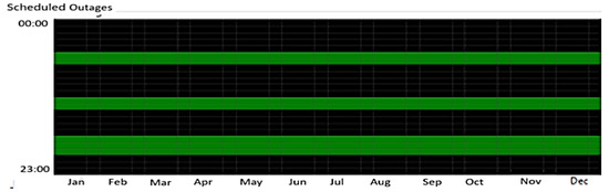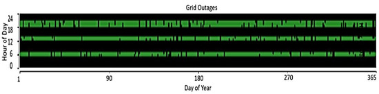 From the above, a more randomised grid profile is generated by constraining the mean outage frequency to 100/yr, with a mean repair time of 3 h and repair time variability of 0%. The grid model produced from the profile is shown in Figure 7, and the constraint parameters presented here are shown in Figure 8. The purpose of this model is to simulate how the grid operates in selected locations. In the model, the green area represents normal operation when there is a power supply, while the black section signifies periods of outage. The data generated by this model are used as input for simulations, allowing the software to better understand the grid’s status in these locations. This forms the basis for the unreliable grid input in the research work. Additionally, to obtain a more insightful result, the model is generated differently for each of the PHCs. It is noteworthy that the designed grid parameters do not allow sales of excess available energy in the centres to be sold back to the grid. Hence, the grid export energy tariff is capped at 0 $/kWh.