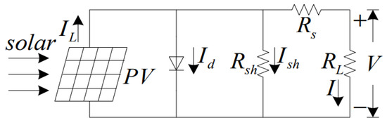 The power output of a photovoltaic cell is determined by several factors, including variation in solar radiation, module temperature, fill factor, shading, soiling, potential induced degradation and module orientation, and tilt angle. The most important factor here is solar radiation. The I–V characteristics of the solar cell change greatly with sunshine intensity S (W/m2) and cell temperature [40,41]. Figure 9 shows an equivalent circuit of the solar cell.