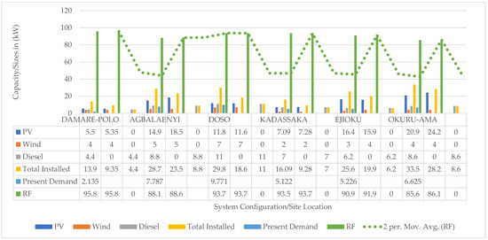 Table 2 summarises the techno-economic data and specifications used in this study. The prices and parameters detailed here are based on recent data from Ngpricehunter websites and distribution companies’ tariff rates [37,38]. The data presented in this section greatly affect the overall system cost, particularly the inflation rates, as the project’s lifespan is 25 years. The annual capacity shortage is set to zero. This ensures an energy supply to the PHCs at every point in time, thus justifying the reliability prospects presented in the design configurations.