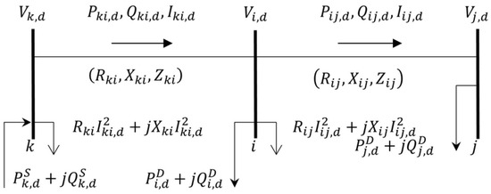 In (6), and , represent the reactive power of branch and branch , respectively, at load level d in scenario t. Both values are expressed in kVAr. Furthermore, indicates reactive power supplied by a DG of type g and represents reactive power supplied by a substation on bus i at load level d in scenario t (in kVAr), correspondingly. The reactive power requested at node i in load level d is represented by (in kVAr).