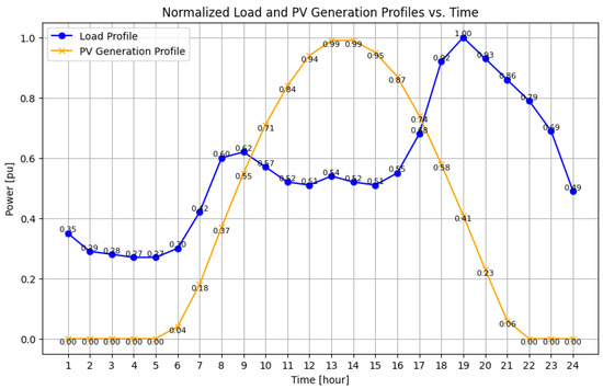 Normalized load and available PV generation profiles.