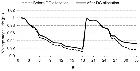 Voltage profile before and after DG allocation for IEEE 33-bus test system.