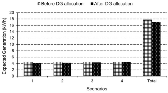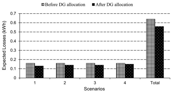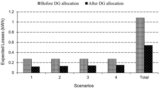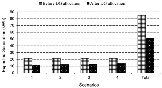In addition, Figure 5 and Figure 6 compare substation bus generation and network losses before and after DG allocation, respectively.