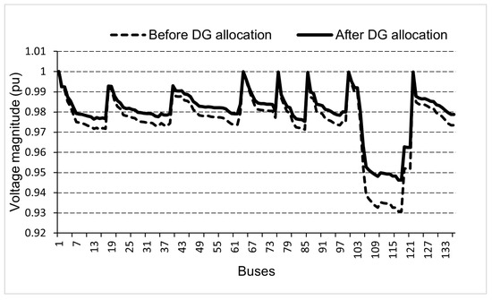 Voltage profile before and after DG allocation for IEEE 136-bus test system.