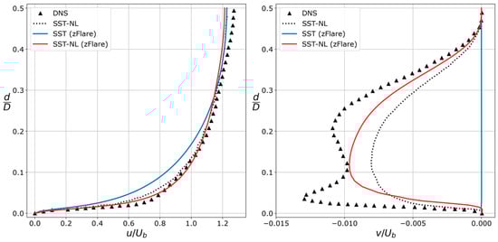 Profiles of the streamwise and spanwise velocity at the diagonal of the duct cross section (DNS [53], SST-NL [51], zFlare).