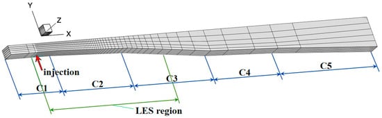 It is well known that hydrogen is a promising fuel at the moment due to its environmental friendliness and other superior physicochemical properties (e.g., [18,19]). The current paper is following the study [20], in which scale-resolving methods were employed for simulating the injection of fuel (hydrogen) into a high-speed turbulent crossflow of “vitiated” hot air. It is worth noting that there are currently few studies of this kind. Therefore, one of the objectives of the current paper is to study issues connected with using scale-resolving methods for this type of flow. Experimental data obtained at the ONERA LAERTE workbench within the LAPCAT II European project [21,22,23] are used. The experiment was conducted on the combustion of hydrogen injected into the high-speed hot air crossflow in a channel with a constant width and a rectangular cross-section. The duct height profile was chosen so as to avoid a steady thermal chocking (an unsteady partial thermal chocking does occur) and provide the conditions for self-ignition at a certain inlet flow regime (named 20151123-R09 in [24], with the Mach number , the stagnation temperature K, the total pressure bar and the equivalence ratio ). Before accessing the duct section, the air passed through a fire heater, where it reached the set temperature due to hydrogen combustion. The resulting hot air contained reaction products. Afterwards, the flow was accelerated to through a de Laval nozzle. The experimental model section with a length of 1.192 m and a width of 0.04 m was set at the outlet of the de Laval nozzle (Figure 1). The duct half-height at the constant cross-section part of the model was 0.0177 m. The hydrogen fuel was injected from the top and bottom walls normally into the flow. The experimental set-up contained optical windows located along the duct, which allowed us to visualize flow structures with high-speed Schlieren imaging and to register the chemiluminescence of the excited OH* radicals. Additional measurements of the streamwise static pressure distribution and stagnation temperature profiles at the model inlet were provided. The experimental facilities and measurement methods are described in [21]. There are 128 wall pressure transducers (with a measurement frequency of 10 Hz), which are connected to the duct by thin tubes. It means that only average pressure values were measured. Additionally, high-speed Schlieren (1 μs exposure time, 12,000 frames per second) and OH* radical chemiluminescence (4 μs exposure time, 4000 frames per second) imaging were applied.
