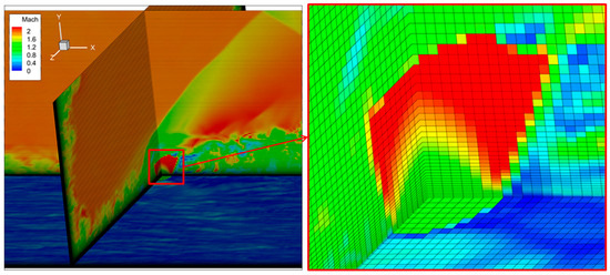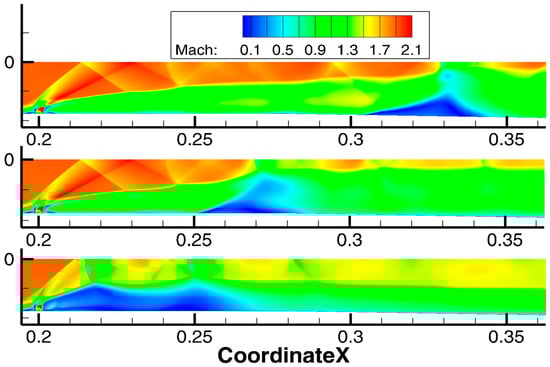 A possible explanation for the difference between the experimental data and the simulations may be an incorrect description of the mixing layer between gases with significantly different densities. A similar problem has already occurred for the authors when modeling the turbulent mixing of helium-air co-flow jets [59]. The source of errors in that case was the interaction of the central-difference scheme and the subgrid model. It was possible to get the results in better agreement with the experiment by increasing the eddy viscosity and changing the value of the subgrid model constants. To test this hypothesis, a simulation was carried out in the field corresponding to the time moment of 0.00205 s, with the values of the constants used in [59]. Figure 16 shows the instantaneous field of the Mach number in the symmetry plane at 0.00069 s after the start of the simulation. It can be seen that the partial chocking has disappeared, the central separation has decreased and moved downstream, and small vortex structures have been suppressed by viscosity. The resulting flow also does not correspond to the experiment. This result indicates a strong influence of the subgrid stress model in this flow, which requires a careful study in the future. Further tuning of the numerical method without a detailed analysis of its impact, according to the authors, is not a reasonable approach.