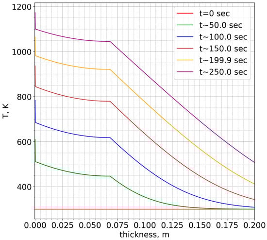 For this purpose, a solution to the one-dimensional heat equation was obtained: , where are the surface normal distance, temperature, density, heat capacity and thermal conductivity, respectively. It was taken into account that a heat-resistant coating was applied to the duct walls, with the main purpose of preventing oxidation and deformation of the duct walls. The average thickness of this coating is 0.0003 m. Then there is the copper wall, which is 0.066 m thick. The rest of the simulation area is occupied by resting air. The parameters for the heat-resistant coating, copper, and air are significantly different. Within each section, these parameters are approximated by a quadratic function of .