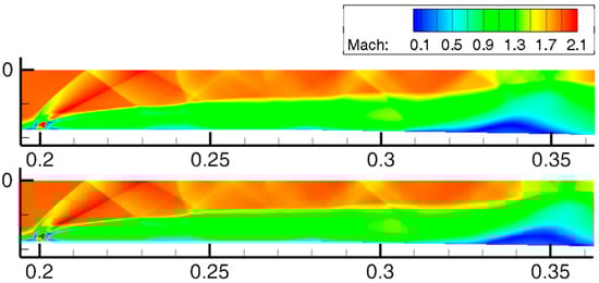 Since no heat-resistant coating was applied to the windows and the thermal conductivity of glass is quite low, the presence of optical windows can be approximated by replacing the boundary condition on the wall with a smooth, heat-insulated, no-slip surface. It was taken into account that the windows occupy three sections along the X axis: [0.1394; 0.5584], [0.6593; 0.8286], [0.9495; 0.1119] (numbers are given in meters) and at the same time cover the entire height of the duct. Figure 6 shows the Mach numbers in the symmetry plane for two RANS simulations with different boundary conditions: without and with windows. As one would expect, taking glasses into account leads to the fact that the separation region located in the center of the duct moves downstream since the integral friction is less. At that, the height of the separation region increases. This is explained by the increase in the second Damköhler number: , where is the amount of heat released as a result of a chemical reaction, is the heat flux into the duct walls, is the heat capacity at constant pressure. In the case of glass . However, the influence of windows turns out to be very moderate and does not lead to a qualitative change in the flow pattern.