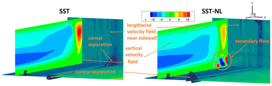 To simulate secondary flows, the nonlinear SST-NL model described above was used in this work. Figure 7 shows two RANS simulations using the SST and SST-NL models. The separation regions in the corners and near the central plane are depicted as isosurfaces of zero streamwise velocity. The streamwise velocity distribution near the bottom and side walls of the experimental model is also presented. In addition, Figure 7 shows a cross-section distribution of the wall-normal velocity component v. It can be seen that in the original setup (left), there is a corner separation opposite to the central separation. When switching to the SST-NL model, secondary flows arise in the corner, and as a result, the corner separation disappears. In this case, the size of the central separation increases, which is consistent with the data in [27,29,30]. Thus, taking secondary flows into account leads to a significant change in the main flow structure, which can be observed in Figure 8 (a quarter of the duct is shown there). The computational domain boundaries are indicated in gray. The isosurfaces M = 1 are shown in a metallic color. The figure also contains streamlines (black curves) and transverse fields of the streamwise velocity u in the cross-section of the duct. It can be seen that the flow is displaced to the side walls of the duct by the central separation. In the case of the SST-NL model, partial chocking is observed since a larger cross-sectional area is occupied by a subsonic flow and the average Mach number over the cross-section becomes less than unity. Additionally, in the case of SST-NL, the streamlines are located more sparsely in comparison with the field obtained using the SST model. Figure 9 shows the Mach number in the symmetry plane, the streamlines of the hydrogen jet, as well as the isosurfaces, where the radical OH mass fraction is equal to 0.017 (burgundy color). It can be seen that the formation of radicals occurs along the perimeter of the fuel jet. In this case, two regions of their presence can be distinguished: the separation zone located under the hydrogen jet and the jet mixing layer. In both cases, the fuel passes from the mixing layer into the recirculation region, which becomes a stabilizer for further combustion downstream since it is a source of hot reaction products. In the case of the SST-NL model, in contrast to the SST, an additional source of heat release is observed directly behind the normal shock. Combustion continuously interacts with turbulence and the gas-dynamic structure—it further increases the temperature and pressure and, therefore, increases the thickness of the BL and the separation height. As a result, the entire structure moves slightly upstream. In this case, the pressure peak almost does not change its location (Figure 10), but its amplitude increases significantly, which is in better agreement with the experiment.