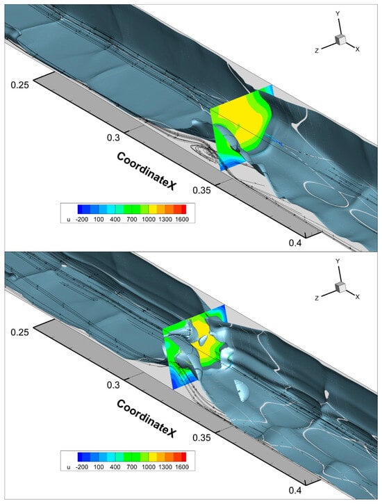 Despite the fact that the RANS simulation was brought to a steady state, in the case of the IDDES, the size of the normal shock above the central separation increased, and the gas-dynamic structure, along with the separation, began to shift upstream. At the time of 0.00205 s, one can observe a downstream displacement of the entire structure associated with the transition from hs = 80 μm to hs = 65 μm. However, after the flow adaptation to the new boundary condition, the upstream displacement of shock waves and the central separation continued. It is noteworthy that in the computation, as well as in the experiment, the instantaneous pressure distributions on the duct wall contain a plateau in the area (0.45; 0.6) m along the X axis. It can be observed in Figure 10, which shows the pressure distribution from the IDDES simulation at 0.00288 s.