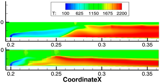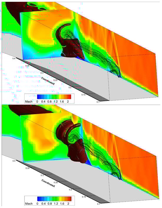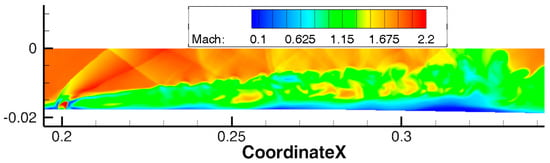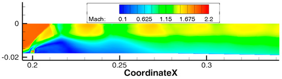 Nearing the time of 0.00400 s, the central separation connected to the recirculation region behind the injected jet. The simulation was continued from this moment until 0.00488 s. During this period, time averaging was carried out to analyze the simulation results. Figure 15 shows the averaged Mach number field. It can be seen that the central separation attached to the injected jet is stationary. This flow pattern does not correspond to the experimental data, according to which the shock wave structure and the region of increased concentration of OH* radicals should fluctuate at X ∈ (0.23; 0.28) m.