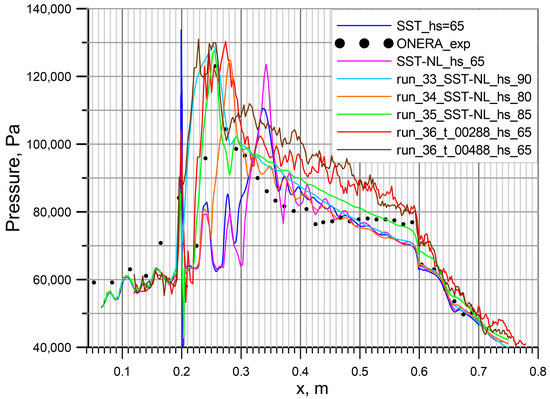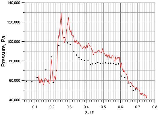 - The first reason for excessive temperature and pressure values in the flow may be the initial field and the first 0.002 s of the simulation, during which hs = 80 μm was maintained. To check this, an IDDES simulation was run from the field obtained in the RANS simulation with hs = 65 μm. Figure 18 shows the simulation at the time moment 0.00204 s; the flow pattern is in good agreement with the experiment. However, the pressure distribution on the wall contains a second peak at x = 0.3 m, which is not present in the experiment. At the same time, the pressure is still overestimated in the area (0.3;0.6) m along the X axis (Figure 19). During further modeling, the gas-dynamic structure oscillated once along the X axis and reached the same state as the previous eddy-resolving simulation.
