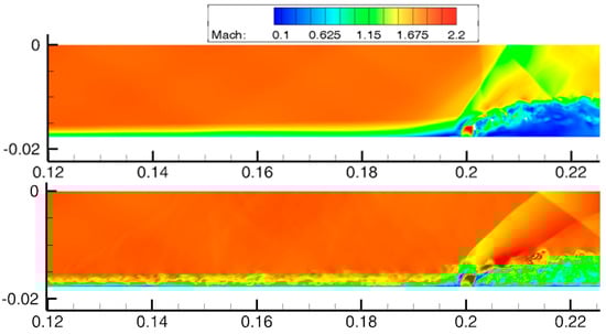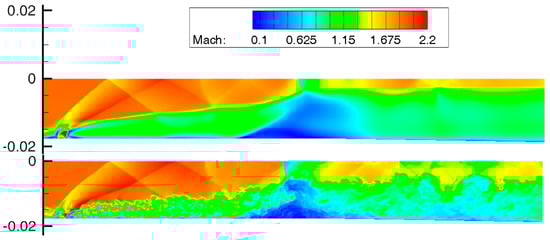 Mach number field in the symmetry plane in the vicinity of the injection. The IDDES without an STG from [20] (top) and the IDDES with an STG (bottom).