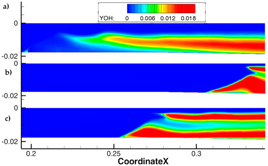 Concentration field of OH radicals in the symmetry plane. (a) averaged IDDES simulation, (b) RANS simulation with hs = 65 µm, (c) RANS simulation with hs = 80 µm.