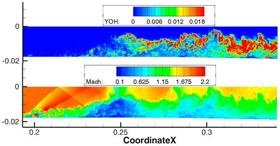 Figure 18. Fields of OH radicals concentration and Mach number in the plane of symmetry at the time instant 0.00204 s. IDDES simulation from the initial RANS field with hs = 65 µm.