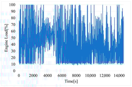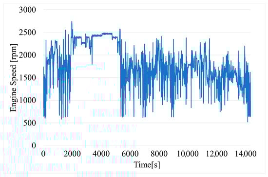 Both engine speed (Figure 4) and engine load (Figure 5) were read directly through the OBD-II interface. Engine speed is a significant factor because it is directly related to the operation of the engine: continuous too-high or too-low RPM can cause increased wear and significantly increased fuel consumption.