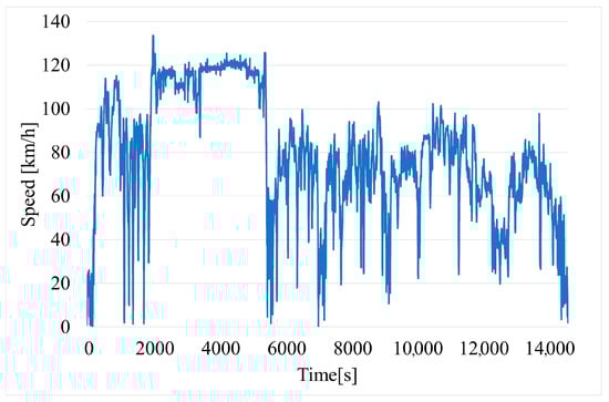 To obtain these data, a test car was selected and was along a route with a total length of approximately 320 km (Warsaw-Rzeszów, Poland) under real traffic conditions. The vehicle used for the road test was a Mazda 3 (Mazda Motor Corporation, Fuchu, Japan) it is shown in Figure 2 and its technical specifications are given in Table 1. The vehicle was driven by one driver. The route was chosen due to the variety of terrain elevation and the presence of urban sections and expressways (different speed limits).