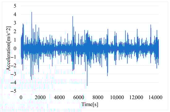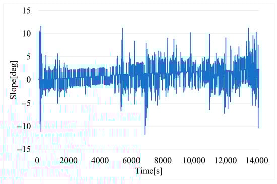 The slope of the road (Figure 8) was determined based on the transformation of the GPS coordinates latitude, longitude, and altitude to north, east, down (NED), which is a geographical coordinate system often used in navigation due to local tangent plane (Earth’s curvature can be ignored for small areas such as roads), its alignment with gravity (the down axis is aligned with gravity), compatibility with GPS (simple conversion form GPS output), etc.