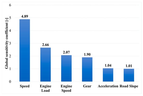 The sensitivity analysis shows that the variables with the greatest impact on fuel consumption (in descending order) are speed (4.89), engine load (2.66), engine speed (2.07), and gear (1.90). Acceleration and slope (with values close to 1) can be ignored or even removed without degrading network performance.