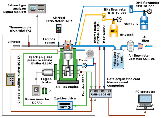 An encoder was mounted on the camshaft, serving as a digital transmitter of the signals of the instantaneous angular position of the engine shaft and the piston TDC (top dead center) marker, directed to the digital ignition controller and data acquisition card. This card also recorded the signal from the pressure sensor of the spark plug processed in the charge amplifier and amplified signals from thermocouples measuring the temperatures of exhaust gases, the fuel–air mixture, the surroundings, and the water jacket. These data were sent to a PC and analyzed and processed programmatically. Air was supplied to the engine intake manifold through a route consisting of a filter, a rotor flowmeter, and a pulsation dumping tank. Gaseous ammonia was taken from the cylinder with a pressure reducer through a flowmeter to the intake manifold, where it was mixed with gaseous DME that was also supplied from the cylinder with a pressure reducer through a second flowmeter. Both fuels were delivered to the intake manifold in gaseous form (PFI—port fuel injection). The research was conducted for the optimal CA50 angle, which required a change in the ignition timing. There was a pressure sensor in the intake manifold. A broadband lambda sensor with a measurement system was installed in the exhaust manifold, as well as an exhaust gas analyzer probe to determine NOx emissions. The diagram of the test stand is shown in Figure 1.