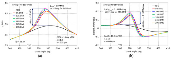 Figure 2 presents a summary of the combustion pressure and pressure rise curves for an NH3-fueled engine with various DME additives ranging from 0% to 29% of the energy share. For a compression ratio of 10, the engine powered by NH3 alone worked, but its operation stability was unsatisfactory (COVIMEP = 30%). To improve the quality of engine operation and combustion stability, DME was added, and with its 8% share, a significant improvement in engine performance indicators was achieved.