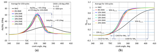 The addition of 8% DME (by energy share) resulted in an increase in the average (from 150 cycles) of the maximum pressure in the engine combustion chamber of 1.35 MPa compared to the engine powered by NH3 alone. There was also a shift of pmax towards TDC of 3.5 deg. Each research point was optimized according to the CA50 criterion. A further increase in the energy share of DME to 24% resulted in an increase in the average pmax value, which for this DME share was 17 deg aTDC and amounted to 3.97 MPa. Increasing the DME share to 28% resulted in a significant decrease in the pmax value to 3.72 MPa. Due to the pmax criterion, it can be concluded that even an 18% DME share provides the optimal pressure value. The analysis of the pressure increase (Figure 2b) showed that the addition of DME provides the (dp/dφ) values desired in an SI engine for its proper operation. For all runs involving DME, peak values (dp/dφ)max occurred around 10 deg aTDC and were in the range of 0.16 to 0.19 MPa/deg. Only for an engine fueled only with NH3, the average (dp/dφ) curve was too flat, which indicates very slow combustion, which does not ensure appropriate gas-dynamic parameters for exhaust gases in the engine cylinder.