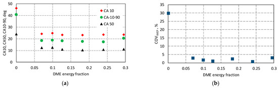 Knowing the values of individual combustion stages provides detailed information about the dynamics of this process. This is especially important for fuels that are difficult to burn, such as ammonia. Knowing the value of the ignition delay CA10 allows for appropriate corrections in the engine control system in terms of the ignition angle. The CA50 value is used to optimize the engine’s thermal circulation, and knowledge of the CA10-90 angle provides indirect information about the engine’s efficiency. Figure 4a presents a summary of individual combustion stages for the analyzed cases of the co-combustion of DME with NH3. For the engine fueled only with ammonia, the CA10 value was 46.2 deg, and the 8% share of DME reduced the CA10 by 22 deg to 24.2 deg.