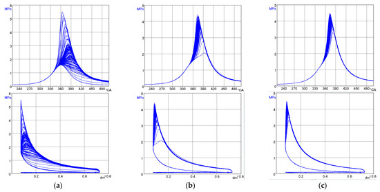 When fueled with NH3 alone, due to the high uniqueness of the engine operation, the CA50 criterion could not be met during the tests. The engine fueled with the addition of DME to NH3 already provided the expected low operating uniqueness of less than 5%, i.e., below the permissible value for industrial engines [28]. Cycle-to-cycle variations often occur in spark-ignition engines, which are very sensitive to changes in the movement of the charge in the cylinder, the local swirls and turbulence of the charge, the uniqueness of the charge composition in subsequent cycles (lambda changes) in the area of the spark plug, and differences in the internal EGR [32]. For an engine powered only with ammonia, very high values of the COVIMEP index were obtained (Figure 4b). The reason for this is that, in many engine cycles, the NH3–air mixture did not ignite, which is visible in Figure 5a and Figure 6. When burning ammonia alone, frequent misfires occurred—on average, once every 15 cycles. Therefore, the engine operation was subject to high IMEP non-repeatability at a level of 30%. It was observed that, in a few cycles (approx. 5%), when ignition occurred with a minimum delay, which for pure ammonia was as much as 40–45 deg CA, ammonia combustion was very effective because the maximum pressure was 100% higher than its average value from all cycles, and the indicated work obtained was 30% higher than its average value. This phenomenon occurred in cycles immediately following cycles without ignition. They can be explained as the result of the accumulation of an increased dose of ammonia in the cylinder. The spread of maximum pressure values in individual cycles was very large, from 1.5 MPa to 5.5 MPa. Adding 10% DME to ammonia almost completely eliminated the instability of the ignition process of the flammable mixture (Figure 5b). Ignition occurred in all cycles, although the value of random ignition delay fluctuations was quite significant at 10 deg CA. But the IMEP uniqueness decreased to an acceptable level of 1.9%. The values of maximum pressure changes were still within a fairly wide range of 2.05–4.2 MPa. Increasing the energy dose of DME to 24% (Figure 5c) only resulted in further improvement of the combustion process. The range of ignition angle changes decreased to 10 deg CA, and the spread of maximum pressure values decreased to the range of 3.2–4.2 MPa. However, the uniqueness of IMEP decreased to 0.9%. With the increase in the DME share, an increasingly early location of the pressure maximum in relation to TDC was observed. This was mainly due to the low LFS of ammonia, which hinders the flame front propagation, which is especially crucial in the initial phase of combustion (the ignition delay period). The low flame front speed in the initial phase of combustion, just after spark-ignition initiation, contributes to an increase in the ignition delay time. Conversely, a significant ignition delay time in piston engines results in an increase in the variability of successive engine cycles.