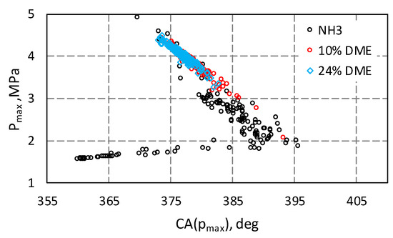 Figure 6 shows the correlation between the value of the maximum pressure (pmax) in the engine cylinder and the angle of its occurrence for three cases, feeding the engine with ammonia only and two cases with 10% and 24% of the energy share of DME.