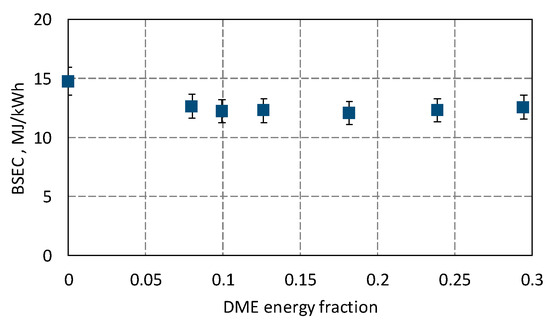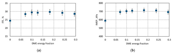 For an industrial combustion engine, its operational and economic values are very important. The engine should not only operate stably but also provide the expected performance (IMEP) and the highest possible efficiency (ITE), using as little fuel as possible to produce a unit of energy (BSEC). Figure 7 shows the influence of the DME share on the efficiency of an ammonia-fueled engine.