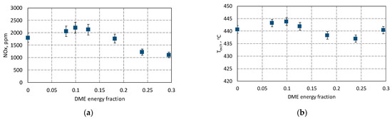 Due to the combustion of ammonia, i.e., a compound of hydrogen and nitrogen, nitrogen oxides (NOx) emissions were controlled. Figure 9 shows the results of the exhaust gas emission assessment and the exhaust gas temperature obtained during the co-combustion of ammonia with DME in a spark-ignition engine. The combustion temperature significantly impacts NOx emissions in the engine’s combustion chamber. The NOx formation mechanism requires access to nitrogen, oxygen, and a sufficiently high temperature for chemical reactions to occur. Of course, finding the right balance between engine efficiency (including combustion efficiency) and NOx control is crucial to meet environmental standards while ensuring optimal engine performance. The highest NOx emissions were obtained using the co-combustion of ammonia with 10% DME.