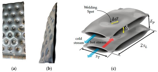 In this study, we focused on configurations in which the PPs are arranged parallel to each other and distanced by = 13 mm. The other specific PP properties are an inflation height of = 8 mm and a typical triangular welding spot pattern with a diameter of = 10 mm. The longitudinal and transverse welding spot pitches are and , respectively.