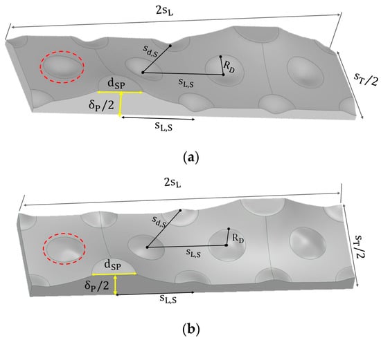 Periodic section of a PP outer channel with dimpled surface: negative (a) and positive (b). Red dash line denotes one of the dimples.