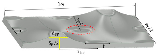 Periodic section of PP outer channel with ellipsoidal surface structuring. Red dash line denotes one of the ellipsoids.