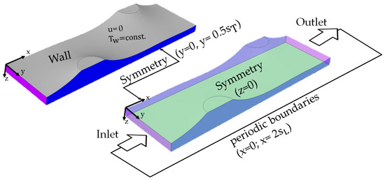The computational effort is reduced by utilizing flow periodicity. It was accomplished by applying periodic boundary conditions for the velocity vector at the inlet (x = 0) and outlet (x = ) boundaries of the channel. This means that the outlet velocity profile was mapped to the inlet after twice the longitudinal pitch (). Furthermore, symmetric boundary conditions at y = 0, y = and z = 0 were applied. At the wall, a no-slip boundary condition (u = 0) was set.