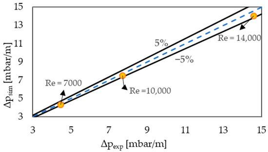 For the validation of the CFD model, we used the PP studied by Piper et al. [2], for which experimental data are available. This PP slightly differs from the selected benchmark: it has an inflation height of = 7 mm and a welding spot diameter of = 12 mm. In Figure 6, the specific pressure drop determined by the CFD simulations is shown together with the data obtained from experiments carried out by Piper et al. [2]. The agreement is good over the entire range of investigated Reynolds numbers (7000–14,000), with a relative error below 5%.