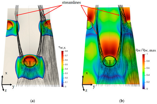 Figure 7 illustrates the flow streamlines and heat transfer phenomena for the benchmark case. In Figure 7a, the formation of recirculation zones upstream of the welding spot is visible; its size can be evaluated by the region of positive wall shear stress in flow direction (). When relating Figure 7b, which shows the normalized wall heat flux (), to Figure 7a, it becomes obvious that the heat transfer is very slow within this area. Similar results were obtained and evaluated for all investigated PPs with secondary structures. The results are summarized in Table 3.