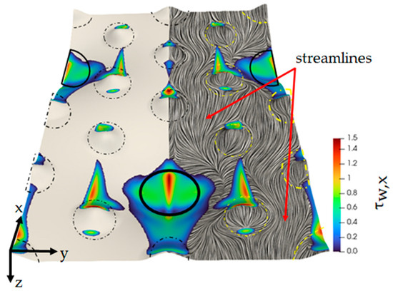 From the analysis of the data given in Table 3, it can be concluded that deeper secondary structures enhance heat transfer due to the intensified near-wall mixing. However, deeper secondary structures also generate larger and more energetic recirculation zones that cause a higher pressure drop. The near-wall mixing is stronger for dimples with negative structures, thus enhancing heat transfer. Figure 8 shows the near-wall streamlines and recirculation zones for the geometry D4.1/−1.5, which yields the fastest heat transfer and the highest pressure drop value.
