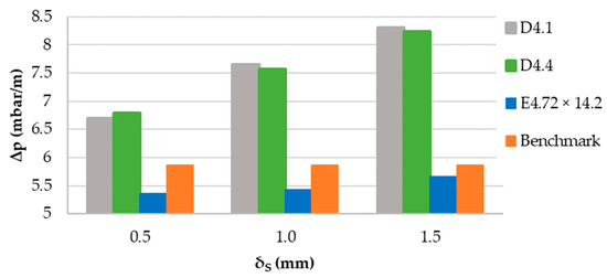 In Figure 9, the pressure drop values for different positive secondary structures are shown. For all positive-structured dimpled surfaces, the pressure drop is higher than for the benchmark. With increasing dimple depth, the corresponding pressure drop also increases. On the other hand, when the radius of the dimple elements () is increased while keeping its depth constant, heat transfer is enhanced and the pressure drop decreases slightly. PPHEs with ellipsoidal secondary structures, with their more streamlined form and arrangement, demonstrate a lower pressure drop than the benchmark.