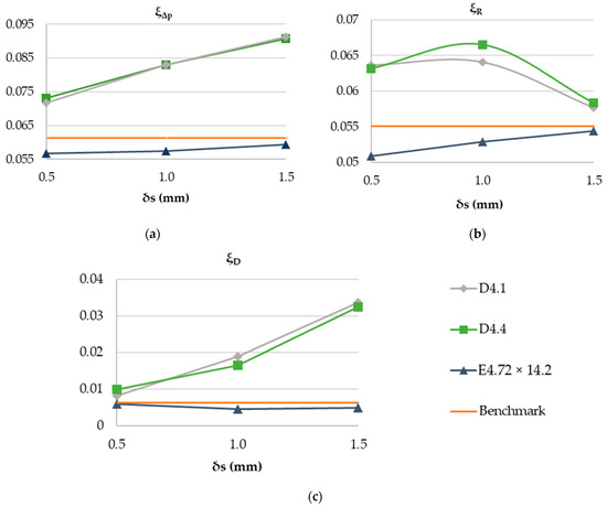In order to gain a deeper understanding of the impact of secondary structures on the pressure drop, it is helpful to compare the friction coefficients. Figure 10 shows the friction factors for different PPHE configurations. For dimpled secondary structures, the Fanning friction factor is larger than that of the benchmark (Figure 10b). This is as expected, taking into account that the secondary structures increase the surface area of the PPs. The form drag coefficient depends on the shape of the secondary structures and has the smallest value for the E4.72 × 14.2/+0.5 configuration (Figure 10c). In fact, all friction coefficients, and thus the pressure drop values, for all of the ellipsoidal secondary structures are smaller than those of the benchmark and the other studied secondary structures.