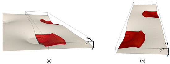 The lower friction factor values for ellipsoidal secondary structures can be attributed to their more streamlined shape and their impact on the shape of the vortex. Such vortices can be detected when negative values of the velocity component in the mainstream direction ( arise. Figure 11 shows the vortices upstream the welding spot in the benchmark. Due to the location and shape of the vortices, the fluid has to bypass these areas, which results in higher form drag and an increased flow path length. This brings about a higher friction. Figure 12 shows the vortices for the case E4.72 × 14.2/+1.5, which has the same value as the benchmark. Here, the vortices are smaller and cover the welding spot, leaving a larger portion of the channel volume free for the flowing fluid. As a consequence, all friction coefficients are smaller. Also, smaller vortices are less energetic, which results in a lower pressure drop. On the other hand, because of the streamlined shape of the ellipsoid structures, the near-wall mixing reduces. As a result, the heat transfer is slower than for dimpled structuring. Yet, due to the lower pressure drop, the thermo-hydraulic efficiency increases. In fact, it is only ellipsoidal secondary structures that permit the value of ε to increase.