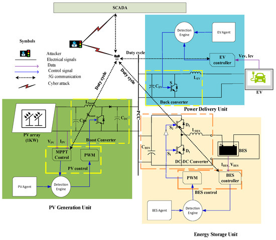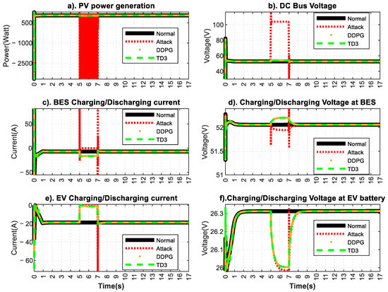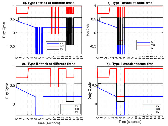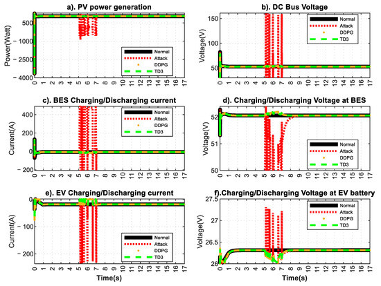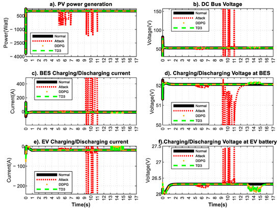 The Type II attack was launched in three different controllers PV controller at 5–7 s, BES controller from 9–11 s, and EV controller from 13–15 s, as shown in Figure 10.