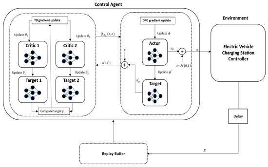 Actor-critic RL learns both value function (as in value-based RL) and policy (as in policy-based RL) and is proven to have better convergence properties, ability to learn stochastic policy, and efficacy in hyperdimensional or continuous action space. The function approximation error in actor-critic RL leads to overestimated value estimates and suboptimal policies [25]. TD3 is the off-policy actor-critic RL designed for continuous action space to minimize the impact of overestimation bias on both actor-critic networks by implementing three tasks. The first one is clipped double—Q Learning, where TD3 uses a minimum of two Q-values to form the target. The second one is the delayed policy updates of the target network. And the third one is the target policy smoothing, where TD3 adds noise to the target action so that the target policy could not exploit Q function error by smoothing out Q along the gradient of action. Algorithm 1 is the TD3 algorithm implemented for the controller agents.