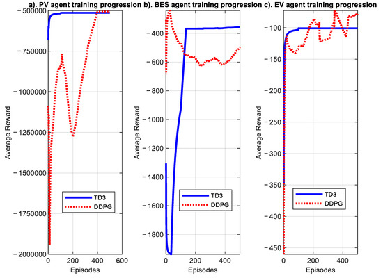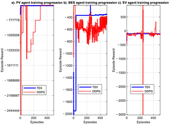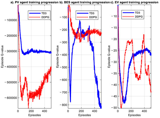 All the computations and simulations were performed in MATLAB 2022 b and Simulink 10.6 model version 5.6 in Dell XPS 15 7590 machine with i7-9750H CPU @2.6 GHz and 16 GB RAM. Each agent took approximately 6.68 h of training for the 500 episodes under DDPG and TD3. The TD3 training progress in terms of average rewards is shown in Figure 5 with stabilized reward within 99 episodes for PV agent, 136 episodes for BES agent, and 101 episodes for EV agent. However, the clones trained with DDPG exhibit poor convergence stability due to their higher sensitivity towards the hyperparameter settings though they were trained with the same hyperparameters and observation spaces as in TD3. The optimal episodes for training DDPG agents are 398 for PV agent, 22 for BES agent, and 348 for EV agent after analyzing the rewards; Q-values as in Figure 5, Figure 6 and Figure 7. The incremental bias and suboptimal policy seen in DDPG training was due to the overestimation of Q-values as they updated the Q-value as in DQN as evident in episode rewards of Figure 5 and the estimated Q-values in Figure 6. That is the reason the DDPG has myriads of suboptimal overshoots till the end of training progression. Therefore, the near optimal policy under DDPG training can be found in 398 epochs for PV agent, 22 episodes for BES, and 351 episodes for EV agent under the horizon of 500 episodes.