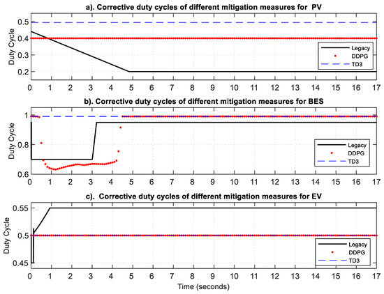 Figure 12 depicts the control actions, i.e., duty cycles of the legacy controllers employed in the EVCS, trained clones with DDPG and TD3 algorithms. Under the normal operation, the legacy MPPT controller at PV stabilizes the duty cycle to 0.2 around 4.8 s. In contrast, the digital clone trained with DDPG and TD3 settles at a duty cycle of 0.4 and 0.495, respectively from the beginning as in Figure 12a. Figure 12b clearly shows the superior control action of TD3 duty cycle converged to 0.99 from the beginning as compared to DDPG BES clone converged to same after 4.2 s. The digital clone of EV controller trained with DDPG and TD3 has produce the same control action, i.e., duty cycle of 0.5. The legacy controllers are a manually tuned heuristic-based control that stabilizes the EVCS operation. However, it takes some time to stabilize the duty cycles. Contrastingly, the control actions taken by DDPG and TD3 are data driven as they optimize the control policy based on maximizing the expected long-term rewards. Therefore, clones are given freedom to choose the duty cycles that perfectly drive the normal operation of the EVCS.