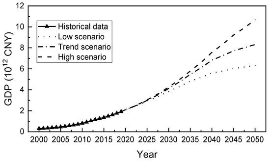 Since its reform and opening-up, Yunnan has undergone rapid economic growth. Nonetheless, Yunnan’s total economic volume and GDP per capita remain below the national average. In 2019, Yunnan’s GDP stood at CNY 1.9189 trillion, representing just 2.3% of the total national GDP, falling short of the 13th Five-Year Plan’s target. The economic trajectory of 2020 was clouded by the COVID-19 pandemic, and no specific growth targets were set. However, Yunnan reported a GDP of CNY 1.1 trillion in the first half of the year, suggesting a promising upswing for the latter half. Consequently, we project a regional GDP of 2.1 trillion for Yunnan by the close of the 13th Five-Year Plan. During the “12th Five-Year Plan” and “13th Five-Year Plan” periods, Yunnan’s average annual GDP growth rates were 11.2 and 9.1%, respectively. As economic development turns into a new normal, the economic growth rate of Yunnan Province is gradually slowing down; therefore, it is reasonable to set the GDP growth rate between 6 and 8% for 2020~2030. Using 2015 as our reference year, we employed compound average growth rate analysis in stages to predict the GDP development in Yunnan using three scenarios with a 5-year cycle (Figure 1). The projection shows that by 2035, Yunnan’s GDP will be CNY 4.8207 trillion, CNY 5.4761 trillion and CNY 5.7927 trillion for low, trend, and high scenario conditions, respectively (Figure 1).